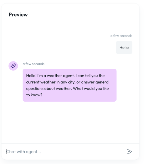 - Agent description (optional): This description is displayed for extra context on the agent list screen you just saw. For this agent you can enter “An agent that can answer questions about the weather” here.